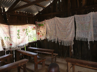 OK, back to our week. On Monday and Tuesday, I went to the district hospital in the mornings and Zavion went to class on the compound. About 120 kids, aged 3-5, travel by foot (some up to 2 hours) each week day for a feeding program/ preschool. They are fed breakfast and lunch (for some, the only meals they will eat) and given about 3-4 hours of lessons. Zavi sat in with the pre-K class and Teacher David. The class has about 40 kids in a room the size of a tiny bedroom. They sit about five to a bench. There is no electricity - an open, paneless window lets in the light; lessons are drawn on burlap sacks that are hung from the walls. Each kid gets one pencil and a couple of scraps of paper. The playground consists of a dusty 'yard' with a makeshift climbing structure and some hanging chains that some of the kids swing from. Compare this to Zavi's fancy classroom and playground at the International School in Harare - it's about as opposite as you can get. Still, it's a great opportunity for these kids who couldn't otherwise afford to go to school (or even eat regularly.) The school is free for them - completely funded by donations. The kids are learning a lot, and are so well-behaved. Zavi joined them enthusiastically the first couple of days and it was so cute dropping him off. 'Bye, Mom, don't worry, I'll be fine!' Of course, he kind of stands out in class - with his lack of uniform, lighter skin, longer hair and taller stature. But he did greet them in Kiswahili - Jambo! Habari? Mazuri!